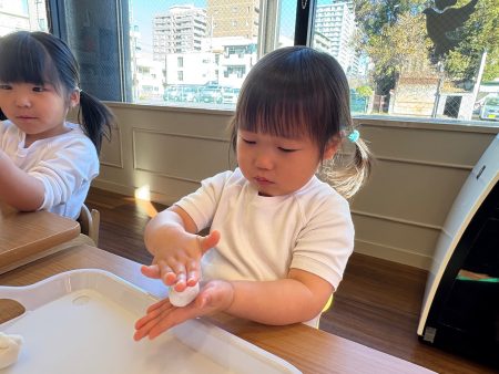 団子作りのコツを教えてもらいました。手を縦にすると細長くヘビみたいになってしまうので、手は横にしてコロコロ丸めます。