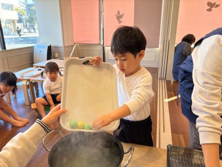 赤・青・黄・緑・白の団子を丸めたら、鍋に入れます。団子が落ちないように両手でトレイを持って鍋まで運んだら、熱々のお湯の中へ♨️