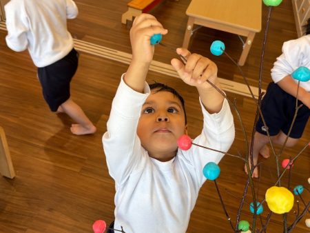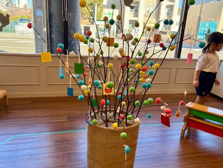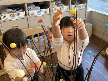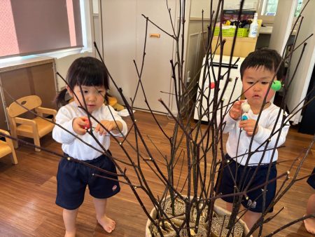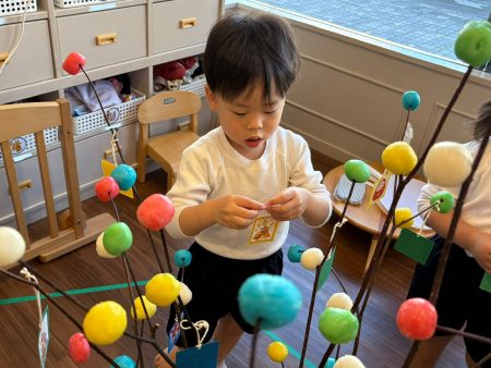 最後は、木の枝に飾り付け✨高いところは背伸びや椅子を台にして、手元もよく見ながら飾りつけて完成‼️