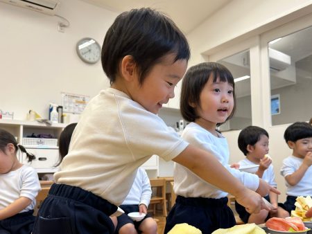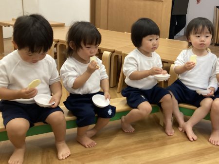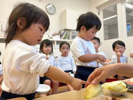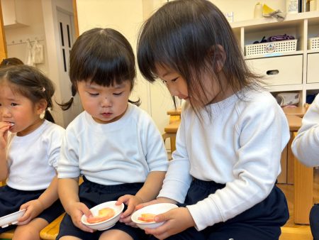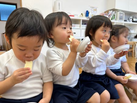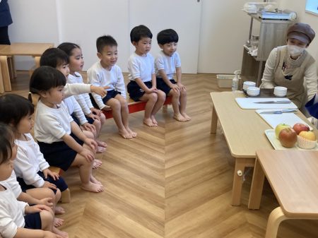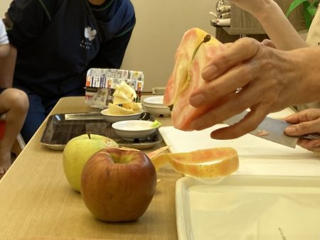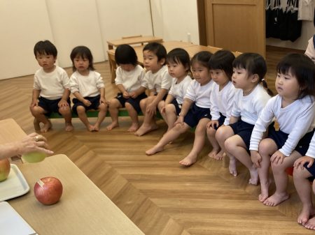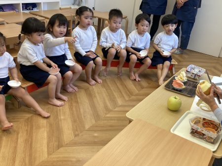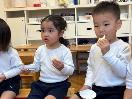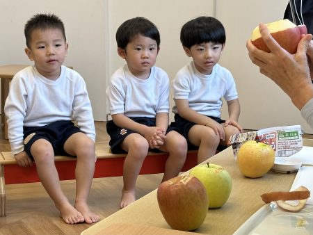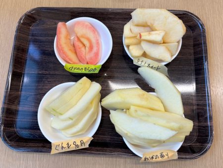 いつも食べているりんご以外のりんごを知ったり、五感を使い見て👀・触って🖐️・においを嗅いで👃・食べて👄違いに気づいたり、自分の『お気に入りのりんご』を見つけてほしいなという思いから食べ比べをしました。次はどんな旬に出会えるかな?