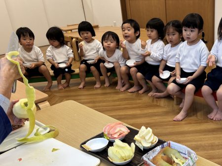 4つ目は、綺麗な黄色の『ぐんま名月』💛シャキシャキとしながらも適度に柔らかいので食べやすく、とっても甘い果汁が口いっぱいに広がります😋剥けた皮を見て「ヘビさんみたいじゃない?」と子どもたち🐍