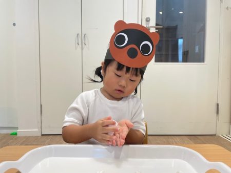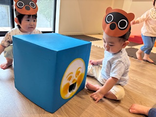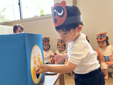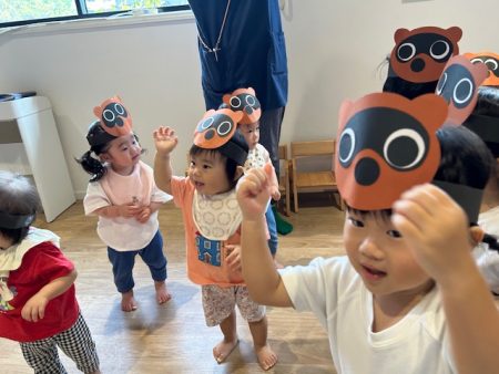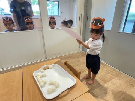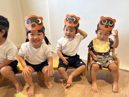 ♪しょうじょうじのたぬきばやしを歌って、♪ぽんぽこたぬきの手遊びを楽しみました😊
