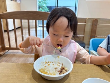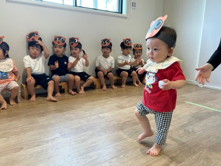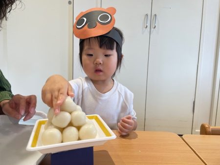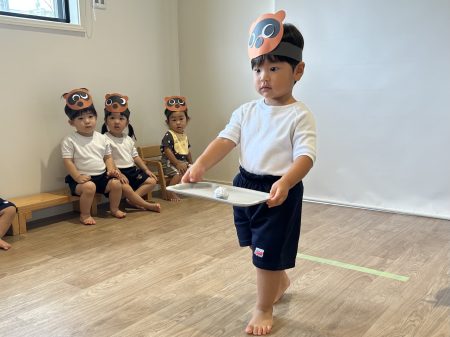 0歳児と1歳児は、お月様に団子をあげるゲームをしました。0歳児はぎゅっと団子を握って、1歳児はトレイの上に団子をのせ落とさないように気をつけて運びます。