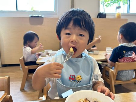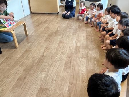 鳩の子保育園の十五夜では、最初に秋の食べ物やススキを紹介しながら、「まんまるお月さまが一番綺麗に見える日が十五夜だよ」「美味しい食べ物をたくさん食べることができて幸せだね」という話をしました。