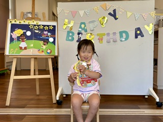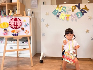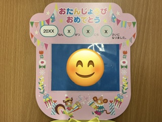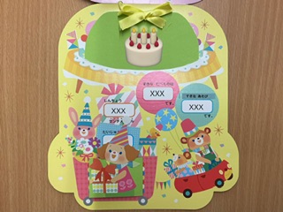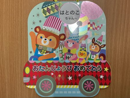 今年の誕生日カードは、キラキラの表紙✨中を開くと、車に乗って来た動物たちがお祝いしてくれています🎁