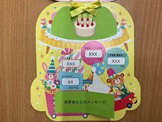 個人写真、ケーキの写真、保育者からのメッセージ、身長、体重、好きな食べ物と遊び、裏表紙には手形🖐️今の子どもたちが記録されていますよ☺️